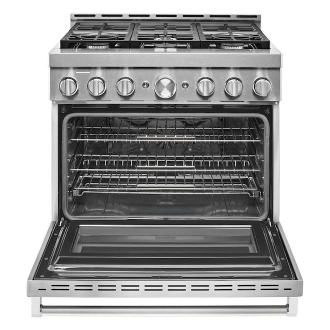 Cuisinez comme un chef en utilisant cette cuisinière commerciale KitchenAid. Son fini acier inoxydable se fond à tout style de décor. Grâce à sa connectivité Wi-Fi intégrée, vous pouvez commander le four à partir de votre téléphone intelligent. De plus, les boutons rotatifs servent à réguler la chaleur des brûleurs. Cette cuisinière à gaz dispose de 6 brûleurs : 5 brûleurs à chaleur élevée, dont 2 de 20 000 BTU et 3 de 15 000 BTU, et 1 brûleur de 5000 BTU. Les premiers permettent de faire mijoter et de saisir les aliments, et le dernier, de cuire les aliments à basse température avec de plus petites casseroles. Le four utilise le système de convection véritable Even-Heat pour cuire uniformément la nourriture. Il dispose de 3 grilles. Par ailleurs, les 3 grilles convertibles de la surface de cuisson peuvent être ajustées à 3 hauteurs différentes selon vos besoins. Cette cuisinière au gaz autoportante peut être placée à n’importe quel endroit dans la cuisine. Elle mesure 36 po de haut x 36 po de large x 30 1/4 po de profond et est assortie d’une garantie limitée d’un an sur les pièces et la main-d’oeuvre. Le système de convection à chaleur homogène est doté d’une conception unique en forme de boucle avec un élément chauffant et un ventilateur qui assurent une circulation d’air homogène et des températures constantes dans tout le fourDeux brûleurs à double flamme de 20 000 BTU de grande puissance vous permettent de régler avec précision les températures élevées et basses, ainsi que la large gamme de températures intermédiairesLe brûleur de 5 000 BTU pour mijoter et fondre, avec une flamme basse dimensionnée pour les petites casseroles, vous permet d’atteindre et de maintenir des températures bassesLes grilles convertibles à trois niveaux avec garnitures amovibles adaptent la chaleur à votre techniqueL’appareil intelligent vous permet de surveiller facilement votre appareil depuis votre téléphone intelligent ou votre tabletteTrois brûleurs de 15 000 BTU fournissent la chaleur élevée dont vous avez besoin pour saisir, faire sauter et porter rapidement à ébullition de grandes marmitesLe bouton de four concentrique double permet de régler d’une seule main le mode et la température du four : deux boutons en un vous permettent de choisir d’abord le mode, puis la températureLa grille de rallonge SatinGlide(MC) facilite la cuisson avec de larges ou lourds plats de cuissonLe système de conversion Easy Convect(MC) ajuste automatiquement les températures de cuisson conventionnelles à leur équivalent en convection