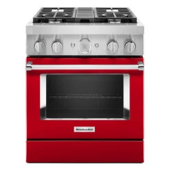 Simplifiez votre processus de cuisson à l’aide de cette cuisinière biénergie KitchenAid avec surface de cuisson et four électrique. Elle comporte quatre brûleurs, dont deux brûleurs à double flamme Ultra Power de 20 000 BTU pour une plus grande polyvalence de cuisson. Cette cuisinière autoportante KitchenAid est dotée de grilles réglables à plaques amovibles avec trois niveaux possibles. La plaque chauffante électrique munie de chrome facilite le retournement des aliments. Sa technologie à convection véritable Even-Heat True Convection assure des résultats de cuisson et de rôtissage uniformes. La couleur rouge de cette cuisinière biénergie KitchenAid de 36 po de hauteur lui confère un aspect classique. Elle est couverte par une garantie limitée d’un an sur les pièces et la main d’oeuvre. La biénergie combine les performances d’une table de cuisson à gaz et d’un four électriqueLe système de convection à chaleur homogène est doté d’une conception unique en forme de boucle avec un élément chauffant et un ventilateur qui assurent une circulation d’air homogène et des températures constantes dans tout le fourDeux brûleurs à double flamme de 20 000 BTU de grande puissance vous permettent de régler avec précision les températures élevées et basses, ainsi que la large gamme de températures intermédiairesLe brûleur de 5 000 BTU pour mijoter et fondre, avec une flamme basse adaptée aux petites casseroles, vous permet d’atteindre et de maintenir des températures bassesLes grilles convertibles à trois niveaux avec garnitures amovibles adaptent la chaleur à votre techniqueL’appareil intelligent vous permet de surveiller facilement votre appareil depuis votre téléphone intelligent ou votre tabletteUn brûleur de 15 000 BTU fournit la chaleur élevée dont vous avez besoin pour saisir, faire sauter et porter rapidement à ébullition de grandes marmitesLe bouton de four concentrique double permet de régler d’une seule main le mode et la température du four : deux boutons en un vous permettent de choisir d’abord le mode, puis la températureLa grille de rallonge SatinGlide(MC) facilite la cuisson avec de larges ou lourds plats de cuisson