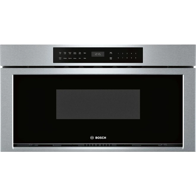 Ce four à micro-ondes de 30″ à tiroir Bosch propose une conception encastrée à profil bas avec des touches électroniques pour l’ouverture et la fermeture du tiroir. Il peut être installé au ras de vos armoires pour un aspect élégant et coordonné avec vos autres appareils Bosch Série 800. Il dispose suffisamment d’espace pour accueillir une casserole de taille moyenne. Niveau fonctionnalité, le four à micro-ondes vous offre 11 commandes prédéfinies, une fonction de cuisson automatique par capteur et un système de verrouillage à l’épreuve des enfants. Garantie limitée d’un (1) an sur les pièces et la main-d’oeuvre. Minuterie avec fonction de cuisson et arrêt automatiqueSuffisamment d’espace pour accueillir une cocotte de 4 pintesInstallation sous un comptoir ou dans une armoire muraleL’écran LCD à commande tactile blanc est assorti aux fours muraux Bosch11 niveaux de puissance prédéfinis pour des options de puissance multiplesConception à profil bas avec ouverture et fermeture tactilesLa sécurité enfant empêche toute utilisation non désiréeLes programmes automatiques pratiques simplifient la cuisson pour un résultat optimal à chaque foisLe dégivrage automatique détermine le niveau de puissance et le temps de cuisson