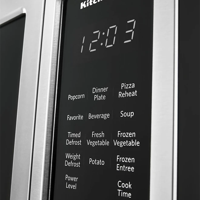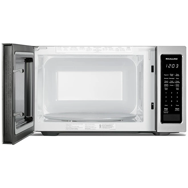 Cuisinez rapidement et en toute confiance avec ce micro-ondes de comptoir KitchenAid conçu pour vous épargner les approximations. Profitez du contrôle que vous offrent 9 cycles de cuisson s’activant par capteur et préprogrammées. Le four à micro-ondes comporte également un mode de dégivrage minuté précis, ainsi que des commandes électroniques intuitives à affichage DEL. Le plateau tournant de 13,5 pouces est encastré pour maximiser la grande capacité de 1,6 pi³ et tourne continuellement tout au long du cycle de cuisson pour cuire les aliments uniformément. Avec une puissance de 1200 W, vous avez toute la puissance nécessaire pour décongeler ou chauffer rapidement de grands plats. Ce micro-ondes peut intégrer un ensemble de garniture de 30 po (modèle MK2160AS) ou de 27 po (modèle MK2167AS), à installer dans une découpe existante, créant un look élégant et encastré lorsqu’il est combiné à un four mural simple. 9 cycles à touche rapide, dont six cycles préprogrammés, pour obtenir des résultats exceptionnels avec votre micro-ondes. Le micro-ondes ajuste automatiquement le temps de cuisson en fonction d’un menu de cycles préprogrammésDécongélation programmée : permet un fonctionnement intuitif en réglant automatiquement le niveau de puissance du four à micro-ondes à 30 % pendant la durée que vous avez choisieCommandes électroniques avec affichage DEL des fonctions programmées qui facilite l’utilisation du micro-ondes et fournit un affichage indiquant les fonctions en cours de programmationLe plateau tournant encastré de 13,5 pouces aide à cuire uniformément les aliments en tournant continuellement pendant le cycle de cuisson. Il est encastré dans le fond du micro-ondes pour maximiser l’espaceAccepte un nécessaire de finition de 30 pouces (référence MK2160AS) ou de 27 pouces (référence MK2167AS) à installer dans une découpe existanteLa grande capacité de 1,6 pi³ fait de ce micro-ondes un véritable complément à un four mural ou à une cuisinièreLa puissance de 1200 watts permet de décongeler rapidement ou de réchauffer même les grands platsArmoire en acier de couleur assortie qui s’harmonise avec votre cuisine et vos appareils électroménagers