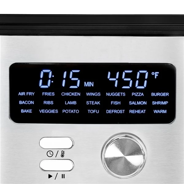 Friteuse à air chaud multifonctionnelle permettant de frire à l’air chaud, cuire, rôtir, griller, décongeler, réchauffer et garder au chaudLa technologie Turbo MAXX et la puissance de 1750 watts permettent de cuire les aliments en une fraction du temps, aucun préchauffage requisFrit à l’air chaud les aliments jusqu’à ce qu’ils soient délicieusement croustillants et dorés, avec peu ou pas d’huileÉcran lumineux à DEL avec commandes numériques intuitives permettant de régler le temps et la température (120 °F à 450 °F)21 préréglages intelligents garantissent des résultats infaillibles pour une variété de platsIdéale pour faire des frites croustillantes, des rondelles d’oignon, du poulet frit, des crevettes, des bâtonnets de mozzarella, des légumes et plus encoreLe panier et le dessous-de-plat à revêtement antiadhésif double sont amovibles et lavables au lave-vaisselleCapacité de 5,68 L permettant de nourrir 3 à 5 personnes, idéal pour les grandes portions de style familial