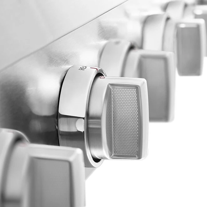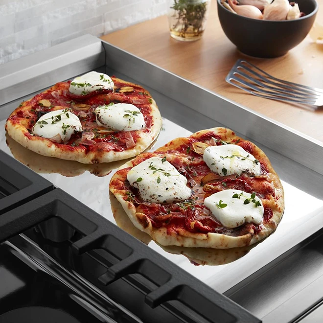 Laissez aller votre créativité avec cette surface de cuisson de 48 po KitchenAid(MD) avec six brûleurs. Elle est dotée de deux brûleurs Ultra Power(MC) à flamme double de 20 000 BTU et un brûleur de 5 000 BTU pour faire mijoter des sauces et faire fondre des ingrédients délicats. La table de cuisson est munie de grilles convertibles à trois niveaux avec anneaux amovibles. Gardez l’anneau à niveau pour saisir et faire sauter à feu vif, retournez-le pour surélever votre poêle au-dessus de la flamme afin de faire mijoter et fondre ou retirez-le pour placer un wok à fond rond dans la flamme. De plus, trois brûleurs de 15 000 BTU fournissent la chaleur élevée dont vous avez besoin pour saisir, faire sauter et porter rapidement à ébullition de grandes marmites. L’appareil comprend également une plaque infusée de chrome offrant un contrôle précis de la température et un chauffage uniforme. Elle vous permet de retourner les aliments les plus délicats, tout en vous procurant l’espace nécessaire pour cuisiner pour toute la famille. Deux brûleurs à double flamme de 20 000 BTU de grande puissance vous permettent de régler avec précision les températures élevées et basses, ainsi que la large gamme de températures intermédiairesLe brûleur de 5 000 BTU pour mijoter et fondre, avec une flamme basse dimensionnée pour les petites casseroles, vous permet d’atteindre et de maintenir des températures bassesLes grilles convertibles à trois niveaux avec garnitures amovibles adaptent la chaleur à votre techniqueTrois brûleurs de 15 000 BTU fournissent la chaleur élevée dont vous avez besoin pour saisir, faire sauter et porter rapidement à ébullition de grandes marmitesLa plaque électrique chromée à chaleur homogène offre un réglage précis de la température et une chaleur homogène pour brunir, saisir et faire croustiller d’un côté à l’autre