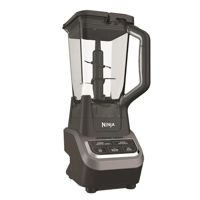 Le mélangeur Ninja Professional 1000 présente un design épuré et des performances exceptionnelles avec 1000 watts de puissance professionnelle. Les lames Ninja Total Crushing vous permettent de broyer la glace, de mélanger, de réduire en purée et d/utiliser la fonction de robot culaire. Le récipient XL de 72 oz du mélangeur professionnel est idéal pour préparer des boissons et des smoothies pour toute la famille. Le mélangeur Ninja Professional 1000 présente un design épuré et des performances exceptionnelles avec 1000 watts de puissance professionnelleLes lames Ninja Total Crushing vous permettent de broyer la glace, de mélanger, de réduire en purée et de réguler la transformationTransformez la glace en neige en quelques secondes et mélangez vos ingrédients préférés pour en faire de délicieuses sauces, trempettes et smoothiesUtilisez le pichet de 72 oz pour préparer de grandes quantités de délicieuses margaritas et daiquirisL’assemblage à 6 lames vous permet de piler la glace plus rapidement et de mélanger les ingrédients plus facilement que les autres mélangeurs