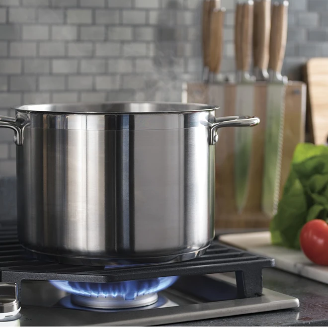 Cette surface de cuisson au gaz GE Profile encastrée en acier inoxydable ajoutera une touche de modernité à votre cuisine. Elle est munie de 5 brûleurs scellés. Ils préviennent les dégâts et facilitent le nettoyage. Son fantastique brûleur central Power Boil génère 18 000 BTU pour faire saisir les viandes ou bouillir de l’eau rapidement. Cette surface de cuisson durable est dotée de grilles continues revêtues de porcelaine qui peuvent être retirées et placées au lave-vaisselle. Profitez d’un espace de cuisson amplement suffisant pour les grosses batteries de cuisine. Le système d’allumage électronique de cet appareil vous fera économiser de l’énergie, tandis que sa fonction de verrouillage prévient les utilisations accidentelles. Le brûleur scellé de la table de cuisson empêche les liquides de couler sous la table de cuisson, ce qui facilite le nettoyage, et les commandes scellées du brûleur à gaz vous permettent de régler la hauteur de la flamme en fonction des besoins de cuissonProfitez de la commodité d’une surface de cuisson plus grande et d’un nettoyage facile avec cette table de cuisson GE côté à côté