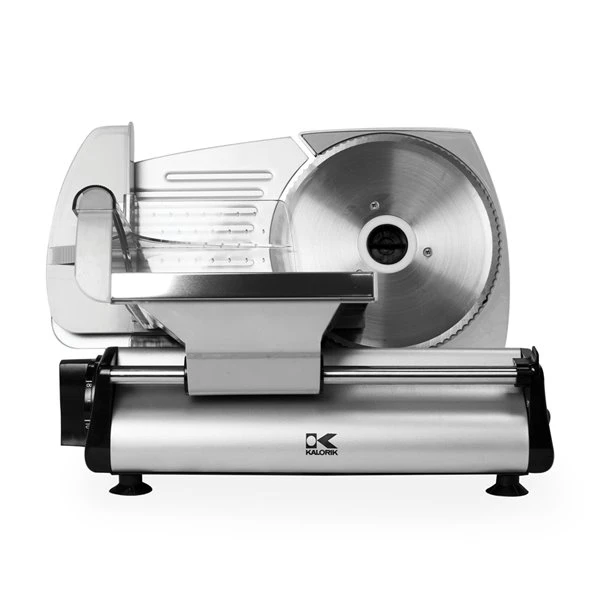 Grâce à cette trancheuse d’aliments Kalorik vous pourrez trancher votre viande, fromage, pain, fruits et légumes, rapidement et facilement. Le contrôle d’épaisseur variable vous permet de mesurer vos tranches : d’extra-fines (1/32 po) à épaisses (1/2 po). Sa grande lame en acier inoxydable dentelée de 7,5 po à usages multiples peut trancher une grande variété d’aliments.Trancheuse professionnelle d’aliments à usage domestiqueDimensions de : 7,5 po (190 mm)Moteur de type AC avec une puissance de 180 WBouton de contrôle d’épaisseur de type professionnel sur le côtéLe plateau à aliments est complètement amovible pour un nettoyage complet et facile dans l’évierLame dentée en acier inoxydable facile à retirer pour le nettoyage et le rangementRéglage précis de l’épaisseur jusqu’à 9/16 po (15 mm)Pieds à ventouse antidérapante